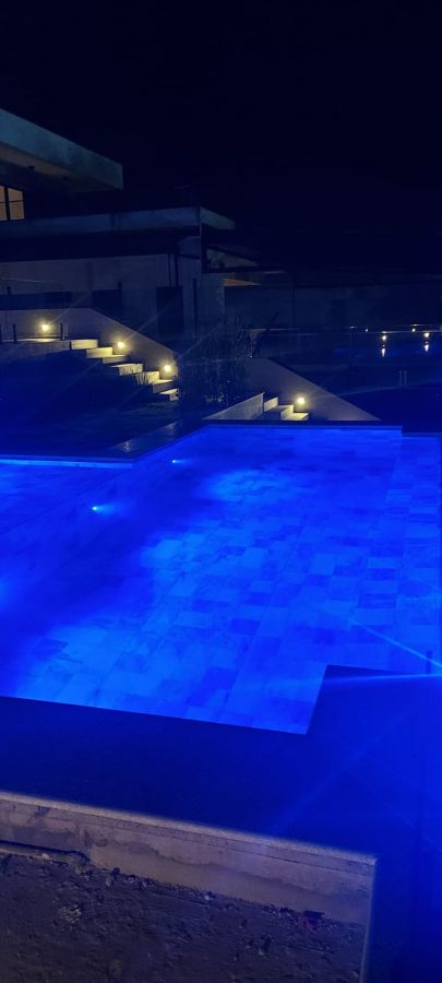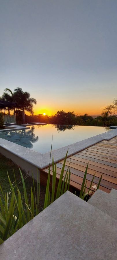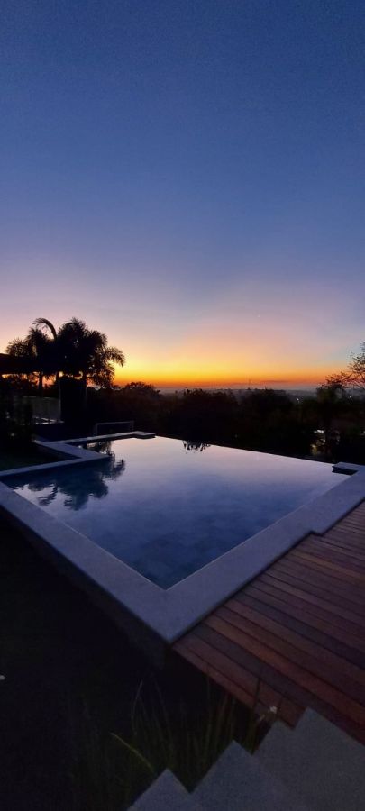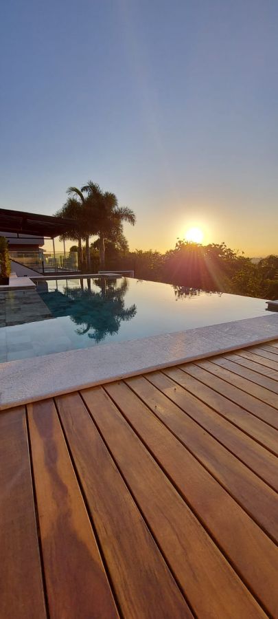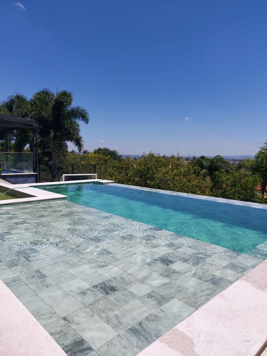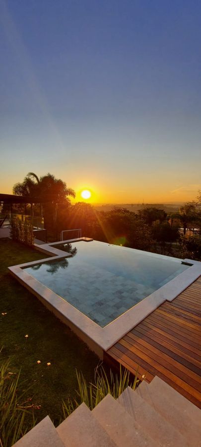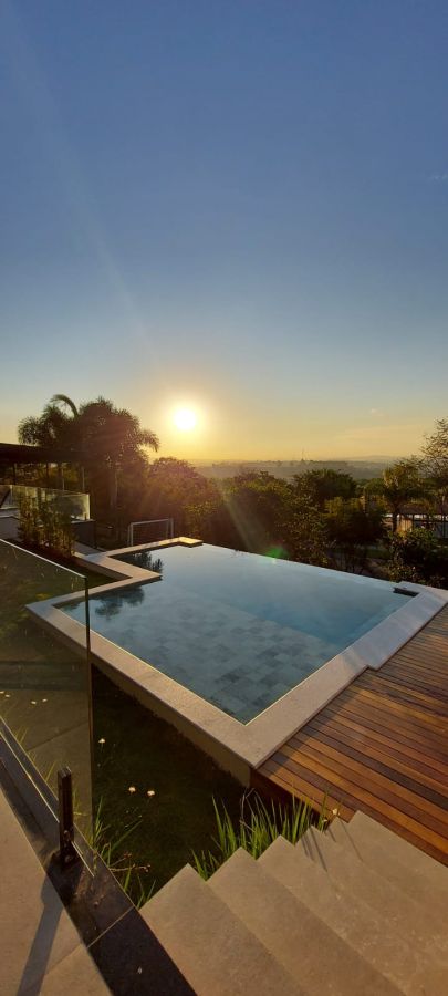 A área externa é um convite ao lazer e ao relaxamento. A piscina em alvenaria com borda infinita e prainha é o destaque, equipada com iluminação de LED e preparação para aquecimento.