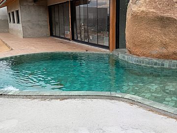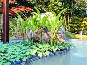O coração desta propriedade é, sem dúvida, sua área de lazer. Imagine-se relaxando em uma piscina cinematográfica com um deslumbrante espelho d'água de 36 m² e uma elegante cascata em pedra natural.