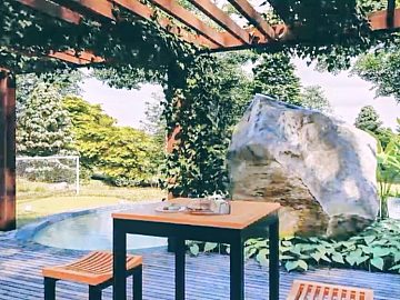 Ao lado, um pergolado de 22 m² em madeira nobre Cumaru cria o ambiente ideal para momentos de descanso.