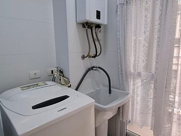 A cozinha, integrada à área de serviço, oferece um layout funcional e moderno.
