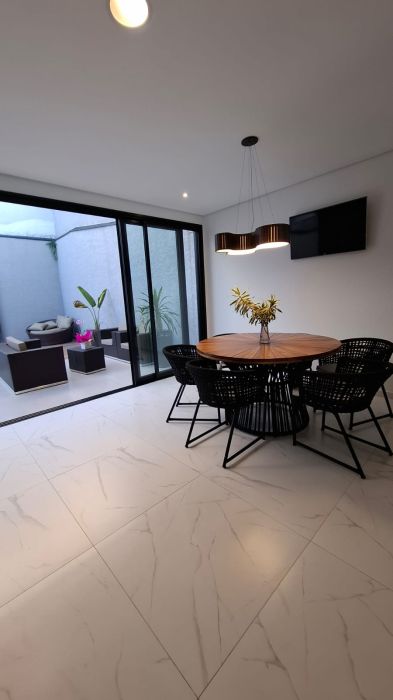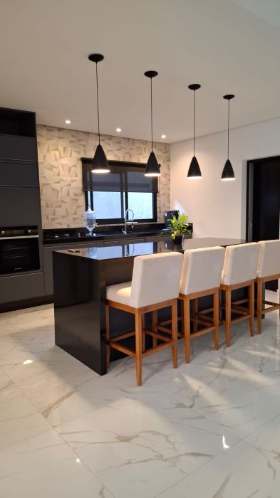 A sala de TV, a sala de jantar e a cozinha moderna se integram harmoniosamente, criando o cenário ideal para momentos memoráveis.
