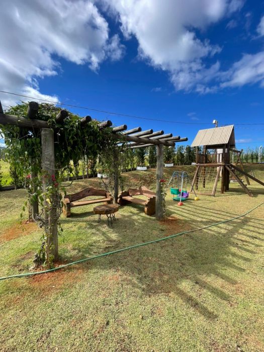 A área externa é um show à parte, com um campinho de grama, um pomar já produzindo diversas frutas, um viveiro de aves e um poço artesiano que garante o abastecimento de água.